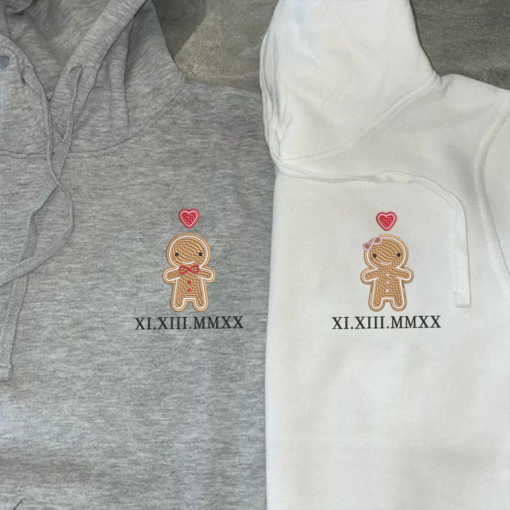 Custom Embroidered Roman Numeral Date Hoodies For Couples, Cookie Cute Gingerbread Christmas Couples Embroidered Hoodie