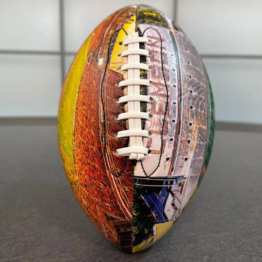One-of-a-kind! Each football is created through a unique process that combines royalty free photography, digital sketching, and watercolor digital painting.