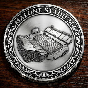 This stadium commemorative coin features a pointillist art design of Malone Stadium. It's an ideal gift for loyal Malone Stadium Medallion football fans and a great addition to any memorabilia collection.