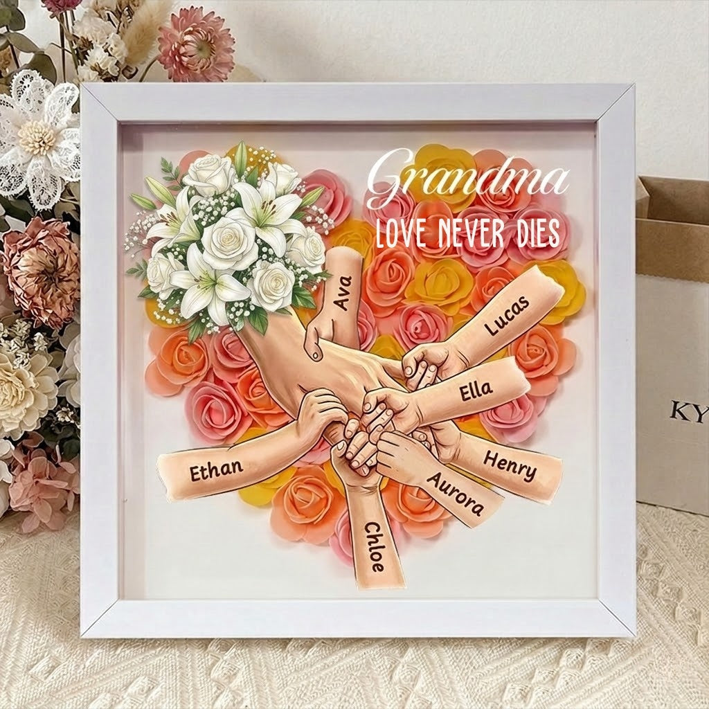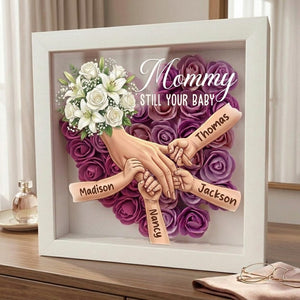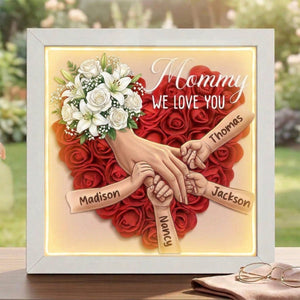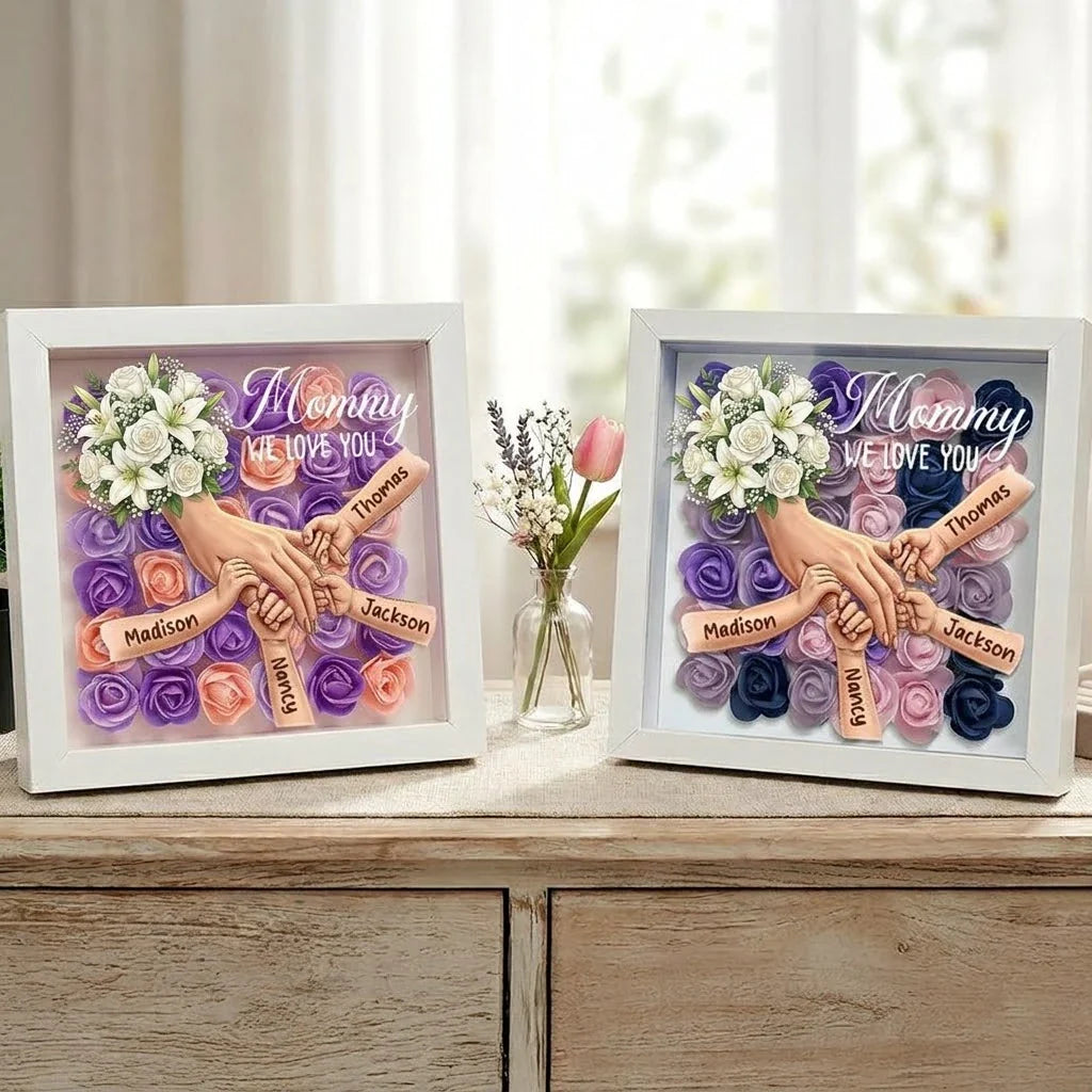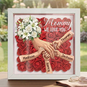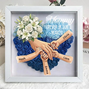 💝 A loving tribute that keeps her presence close to your heart. This memorial shadow box features a gentle floral heart background and a touching illustration of hands holding—honoring the everlasting bond between a mother and her children.