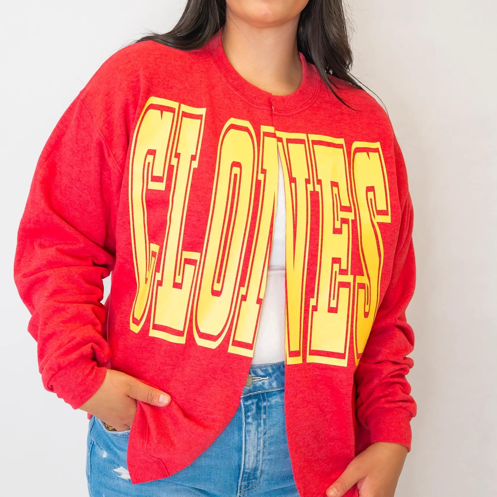 hand cut down the middle (no 2 sweatshirts will be the same) Graphic letters may have slight distressing.