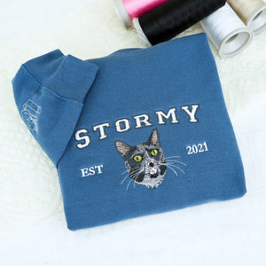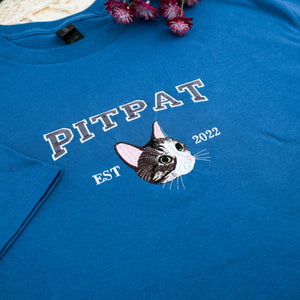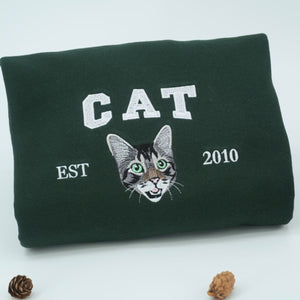 Transform your beloved cat's photo into a stunning varsity-style embroidered hoodie! Our premium cat portrait hoodies feature high-quality custom embroidery with your pet's name and established year. Perfect for cat moms, cat dads, and pet lovers who want to showcase their fur baby in style. Each hoodie is carefully crafted from your photo with precise detail and varsity college aesthetics. Ideal for cat parent gifts, memorial pieces, or treating yourself to premium pet apparel.