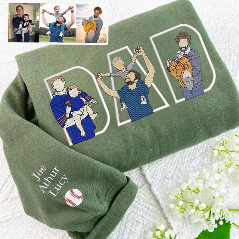 Celebrate the special bond between a father and his children with this custom embroidered sweatshirt. Featuring the word "DAD" filled with beautifully stitched illustrations based on your own family photos, this sweatshirt makes a heartfelt gift for Father's Day, birthdays, or any occasion.