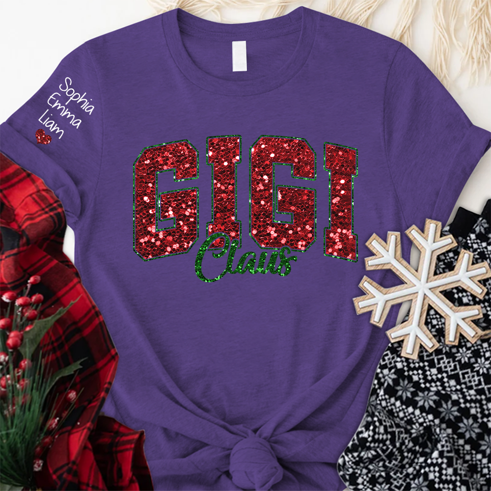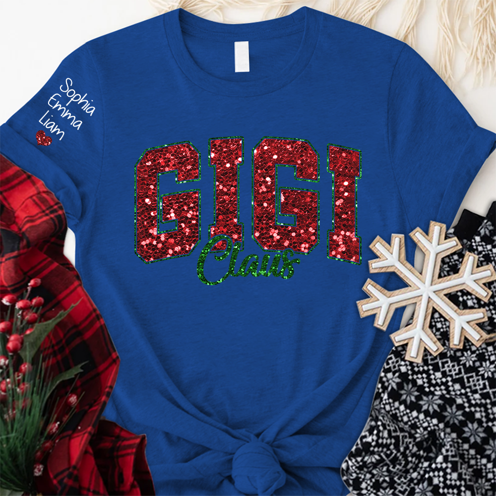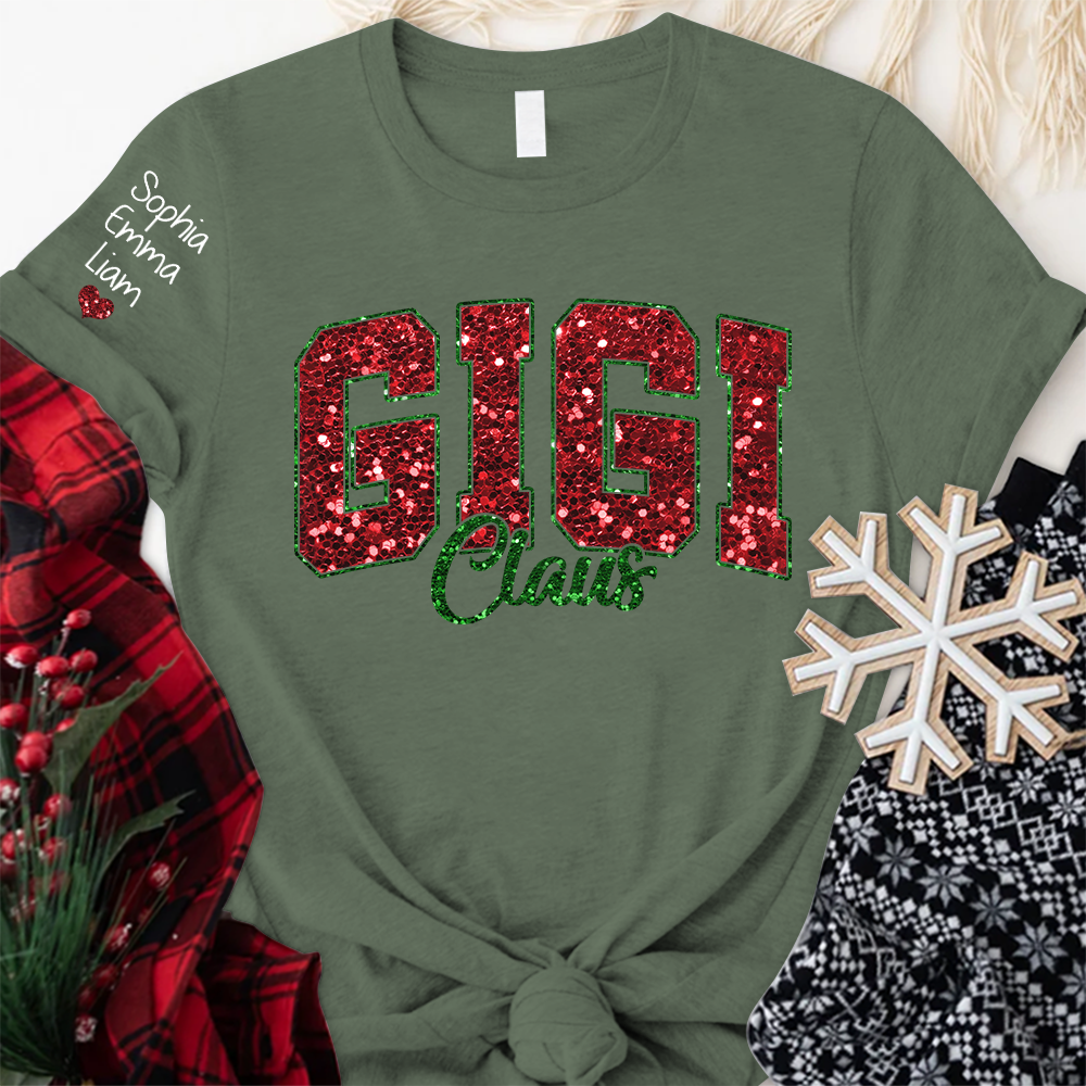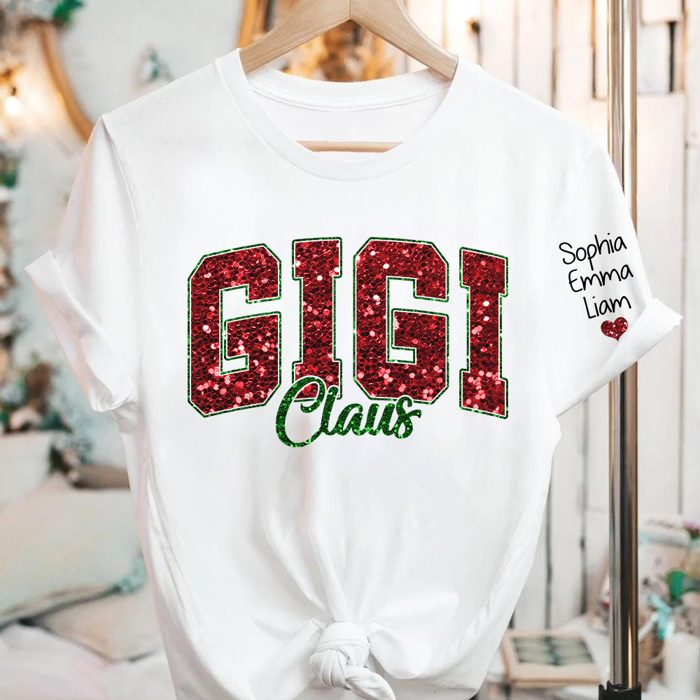 Custom Sequin Applique Embroidered Gigi Claus Christmas And Kids name T-Shirt