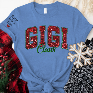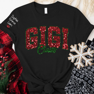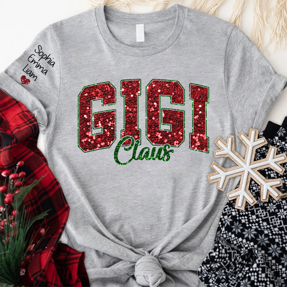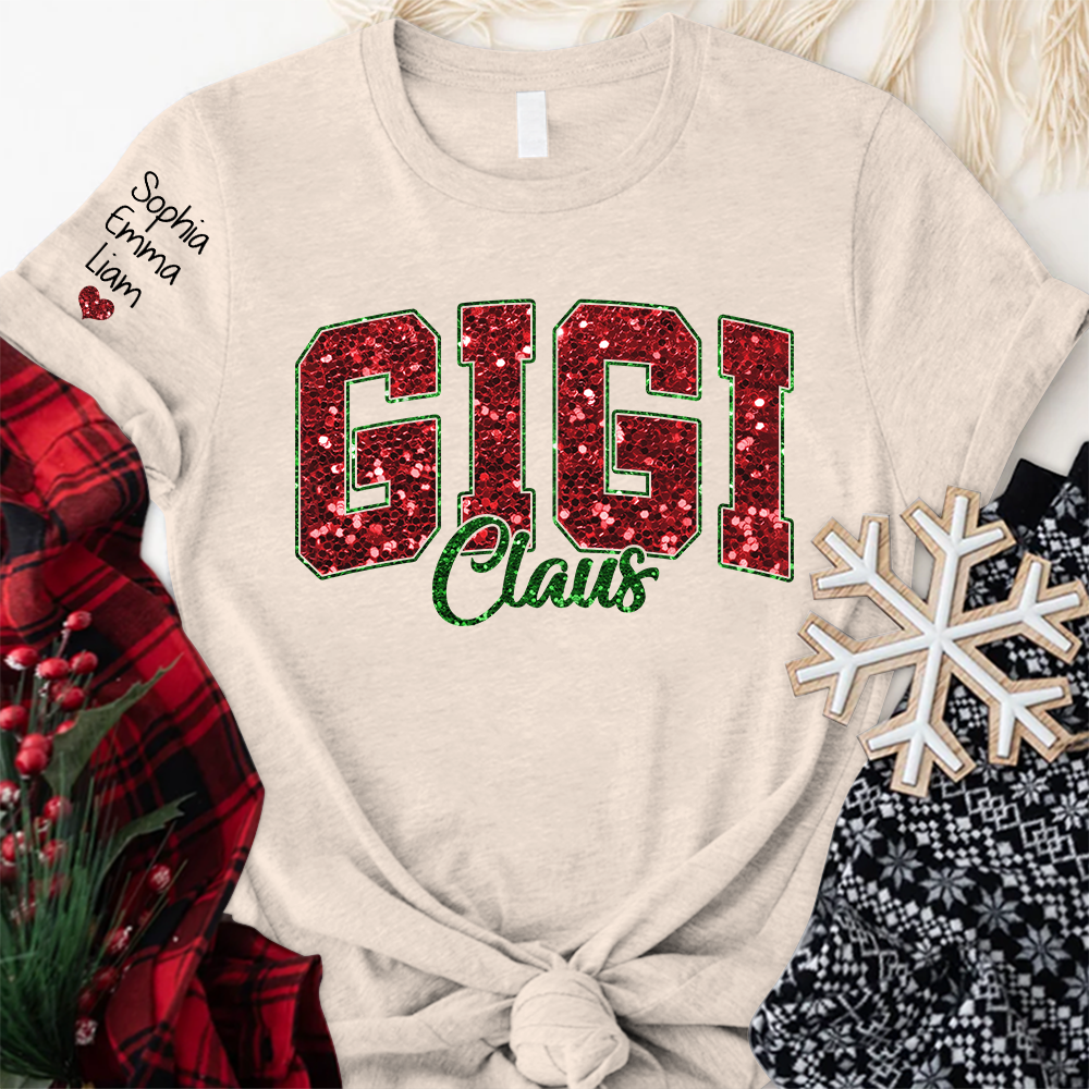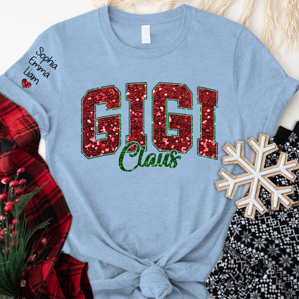 Custom Sequin Applique Embroidered Gigi Claus Christmas And Kids name T-Shirt