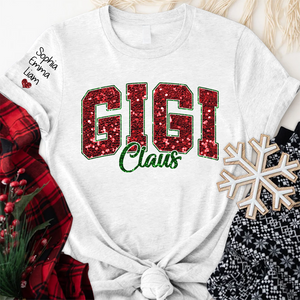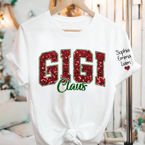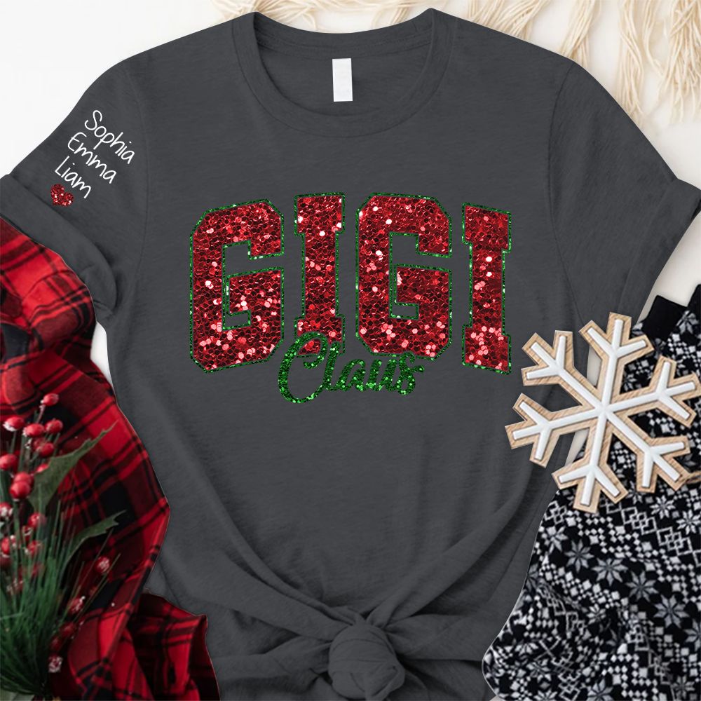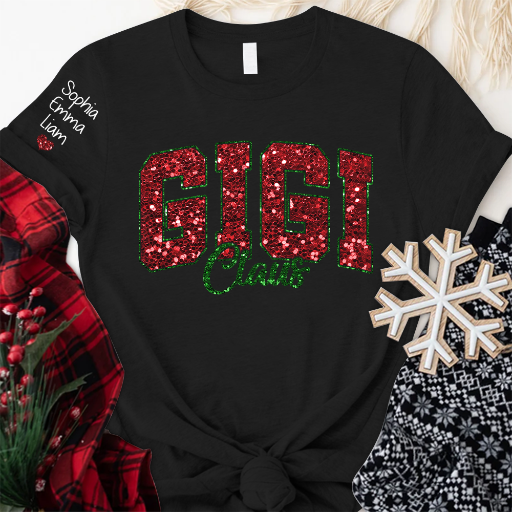 Home Custom Sequin Applique Embroidered Gigi Claus Christmas And Kids name T-Shirt
