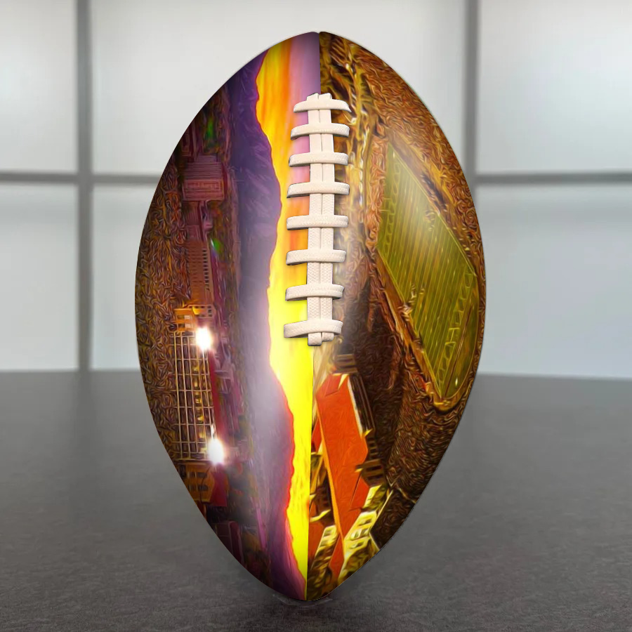One-of-a-kind! Each football is created through a unique process that combines royalty free photography, digital sketching, and watercolor digital painting.