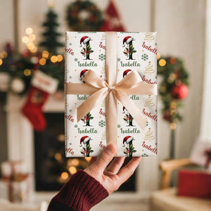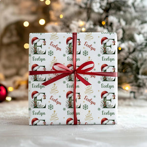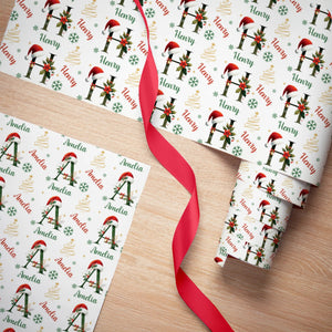 This wrapping paper features a pristine white base adorned with letters wearing Santa hats, holly decorations, gold-lined Christmas trees, and falling snowflakes. Every detail exudes a rich festive atmosphere, conveying warmth and joy, instantly immersing you in the magic of Christmas. The personalized name and initials add a unique touch to each gift, making the recipient feel truly special.
