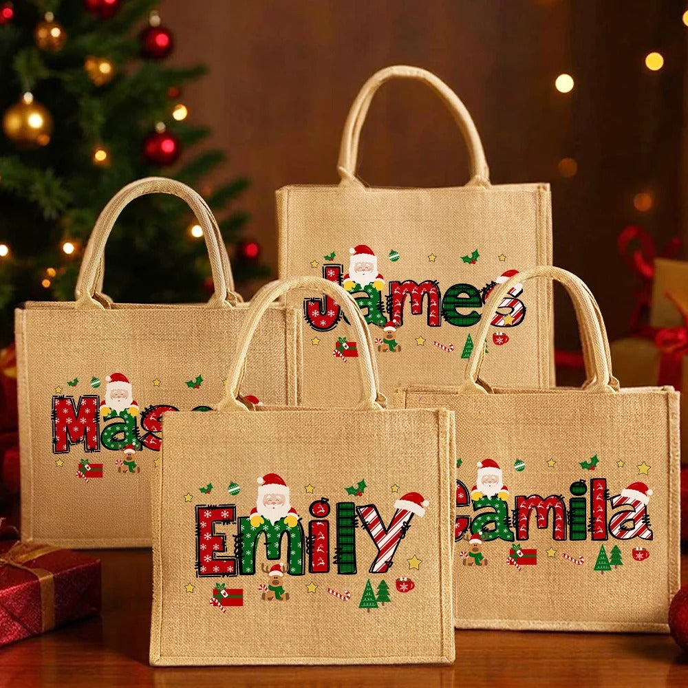 Home Personalized Cute Santa Christmas Theme Letters Reusable Jute Tote Bag with Name Christmas Holiday Gift for Kids Family
