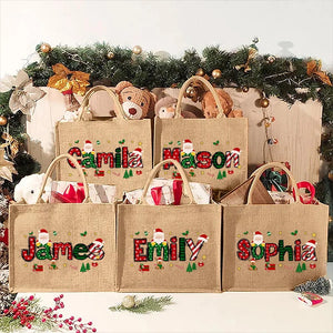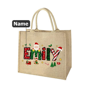 Personalized Cute Santa Christmas Theme Letters Reusable Jute Tote Bag with Name Christmas Holiday Gift for Kids Family