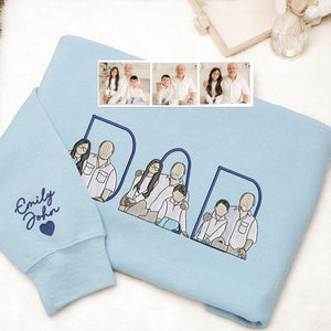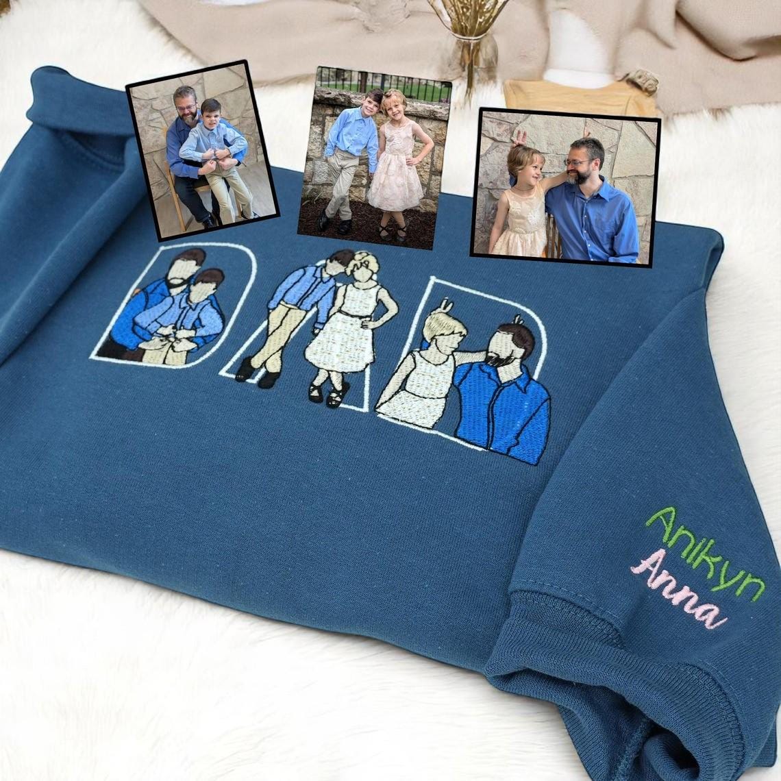 Our custom embroidered sweatshirts and embroidered portraits are a thoughtful and unique choice!💖 Each piece is personalized with a portrait taken from a photo, beautifully embroidered on an embroidered sweatshirt or t-shirt. Add a special touch with the children's names on the sleeve for a one-of-a-kind personalized gift🎁. Whether it's a hoodie or a shirt for dad, these personalized gifts are perfect for celebrating dad's love and creating lasting memories.