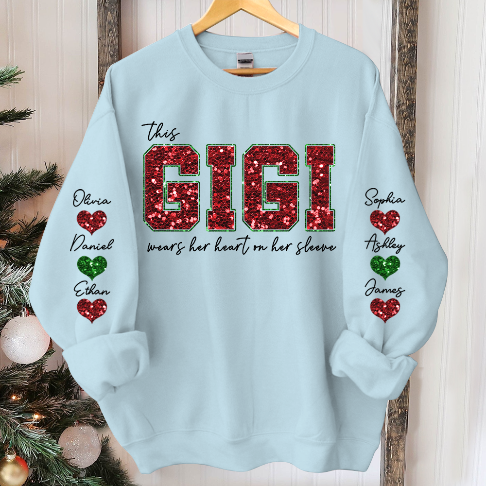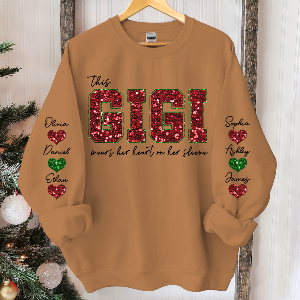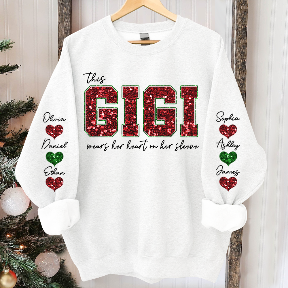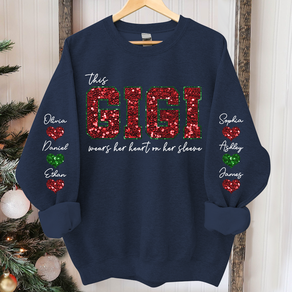 Custom This Gigi Wears Her Heart on Her Sleeve And Kids name Sequin Applique Embroidered Christmas Sweatshirt