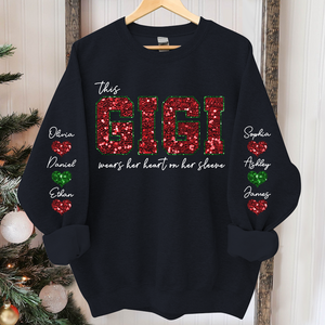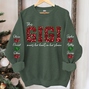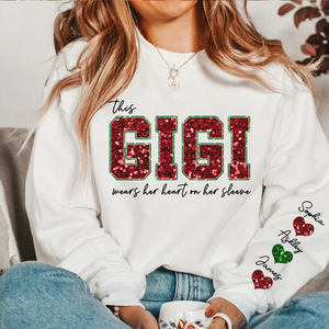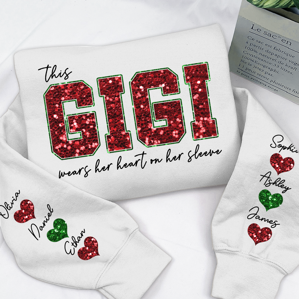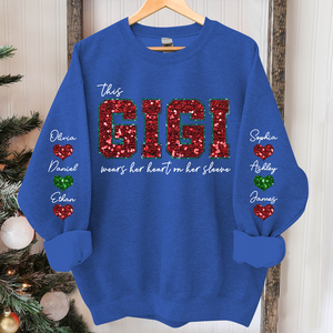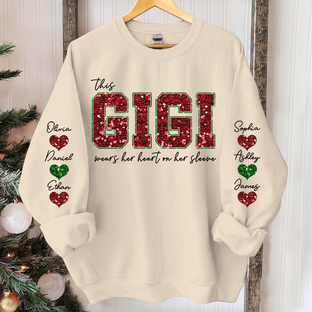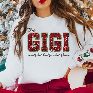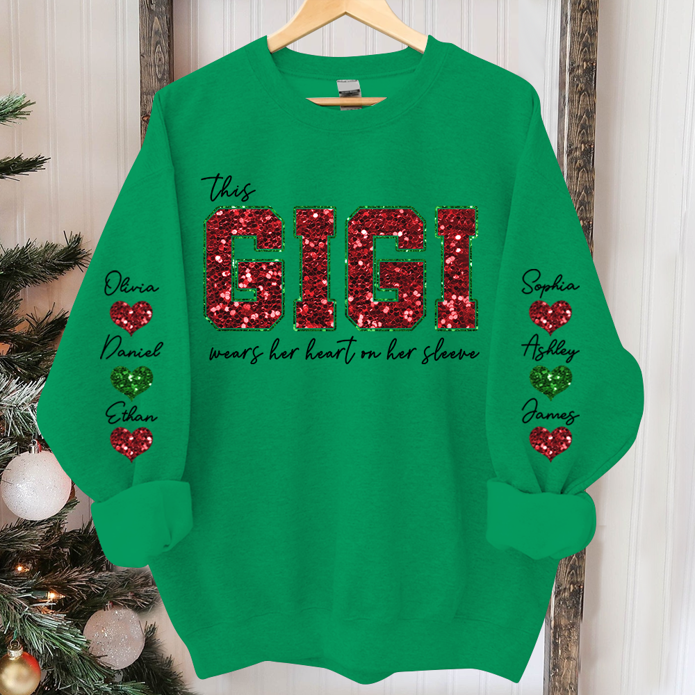 Custom This Gigi Wears Her Heart on Her Sleeve And Kids name Sequin Applique Embroidered Christmas Sweatshirt