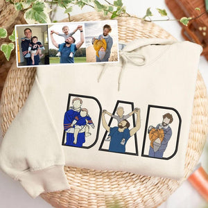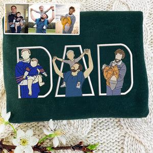 Celebrate the special bond between a father and his children with this custom embroidered sweatshirt. Featuring the word "DAD" filled with beautifully stitched illustrations based on your own family photos, this sweatshirt makes a heartfelt gift for Father's Day, birthdays, or any occasion.