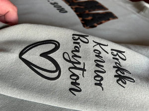 The Mama Leopard Print Personalized Sweatshirt or Hoodie with Kids Name Sleeve is a trendy and personalized garment designed to celebrate motherhood in style. Featuring a fierce leopard print and customizable sleeve with kids' names, this sweatshirt or hoodie is a fashionable statement piece that honors the bond between a mother and her children.
