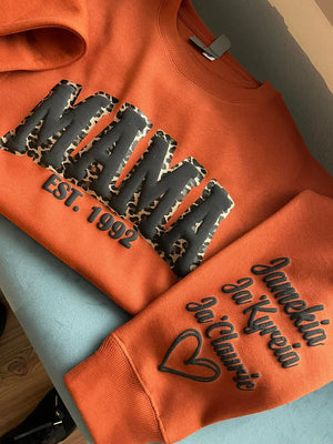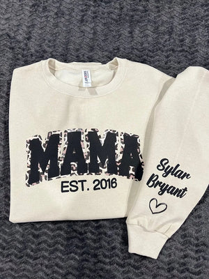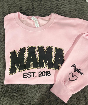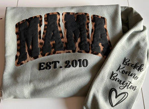 Custom Mama Leopard Puff Print Personalized Sweatshirt or Hoodie with Kids Name on Sleeve | for Mama and Grandma Gift