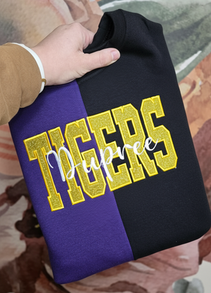 Hem Custom Two Tone Glitter Mascot Sweatshirt School Team Split Fashion Embroidered Sweatshirt